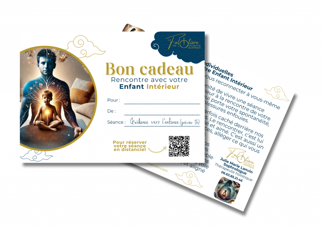 Séance de Guidance vers l'Enfance Lors de cette séance, vous serez guidée vers votre enfant intérieur pour apaiser les blessures du passé et retrouver l'harmonie en vous. À travers des exercices de sophrologie et des outils de développement personnel, vous apprendrez à écouter les messages de votre enfant intérieur, à libérer les émotions enfouies et à rétablir la confiance et la sérénité. Cette guidance vous permet de guérir des souffrances anciennes, renforcer votre confiance en vous et renouer avec votre essence la plus pure. Un moment essentiel pour rétablir l'équilibre et avancer avec plus de légèreté.
